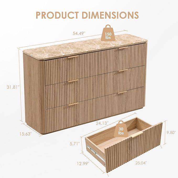 - Modern Luxury Design – Refresh your home with this elegant dresser showcasing wave-pattern fluted fronts and sides, clean modern lines, and champagne gold or black handles. The faux marble top and smooth curved corners add a refined touch while enhancing safety, seamlessly blending into contemporary, modern farmhouse, or transitional interiors