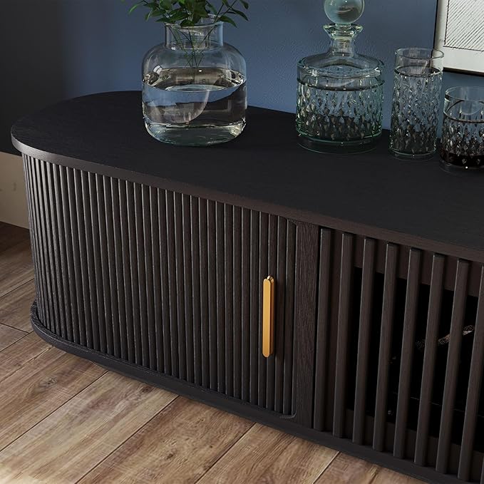 - Sleek Curve Round Edge: The smooth curved round edge tv stand with storage, rolling slatted door solid wood tv console, soften the look of the streamlined frame, provide an environment safe for the little ones. Its aesthetic appeal makes it suitable for both living rooms and bedroom