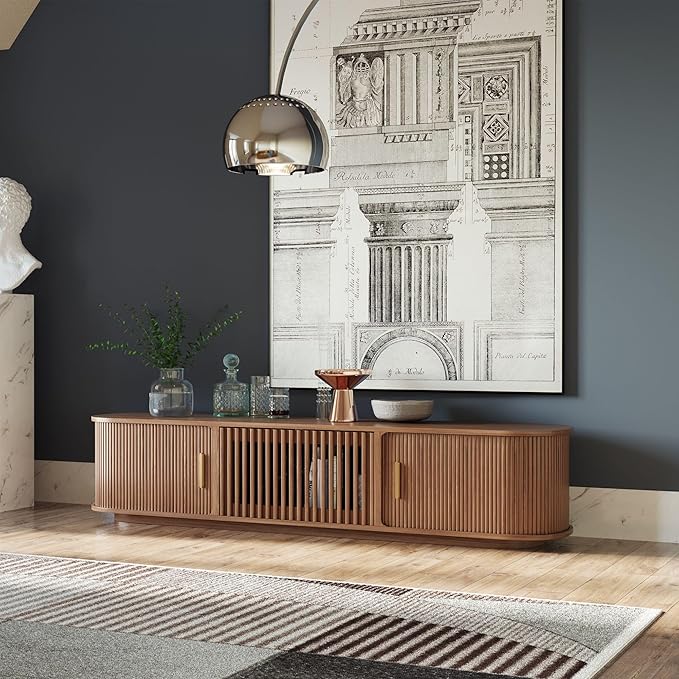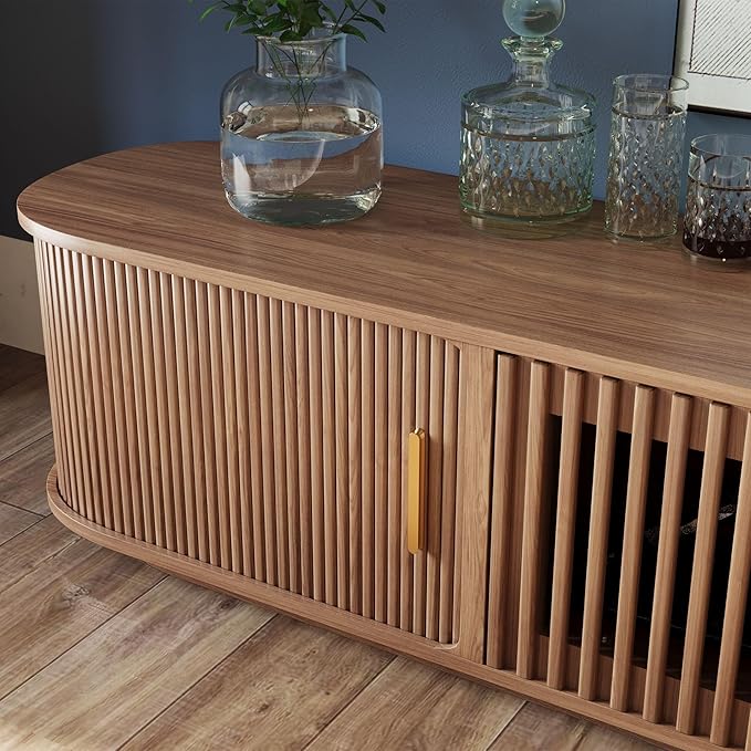 - Sleek Curve Round Edge: The smooth curved round edge tv stand with storage, rolling slatted door solid wood tv console, soften the look of the streamlined frame, provide an environment safe for the little ones. Its aesthetic appeal makes it suitable for both living rooms and bedroom