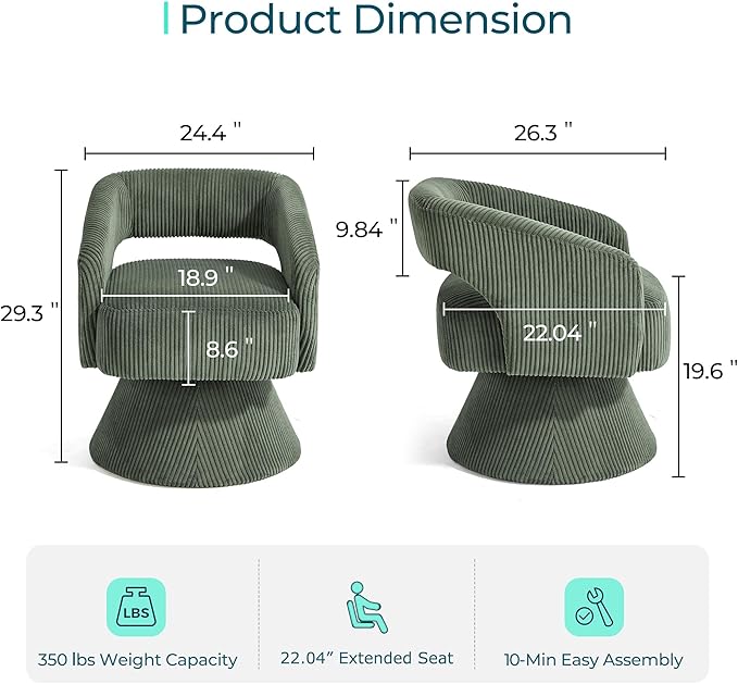 - Stylish & Versatile Design: Green swivel chair is a versatile addition to any home. Its clean lines and modern color scheme blend seamlessly with any decor. The compact footprint is perfect for optimizing small spaces like a cozy bedroom or a home office, saving room without sacrificing comfort. The open back design enhances airiness and gives the illusion of more space