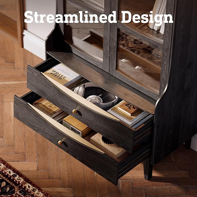 - 【𝐃𝐮𝐫𝐚𝐛𝐥𝐞 & 𝐒𝐭𝐚𝐛𝐥𝐞 𝐚𝐧𝐝 𝐒𝐚𝐟𝐞 𝐃𝐞𝐬𝐢𝐠𝐧】Built with high-quality MDF and a reinforced structure, this book shelf with drawers can support up to 44 lbs per shelf.The shelves are spacious and sturdy—perfect for holding everything from heavy hardcovers to decorative pieces.The rounded edges and anti-tipping devices,improve its safety and stability. The rich walnut(Black) finish and sturdy design,and the arched top adds such a unique architectural detail—Ensure it’s as durable as it is beautiful, providing long-lasting reliability and elegance.