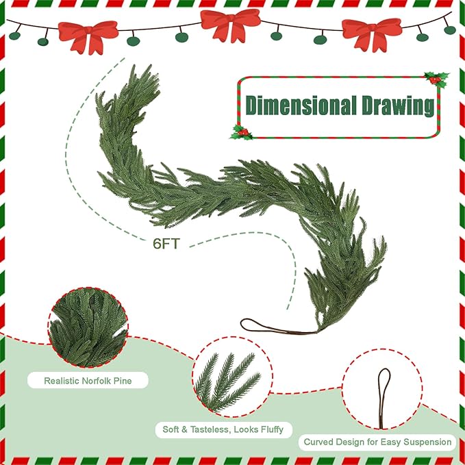 - 【DIY Decor】: Personalize your holiday setup with our Norfolk Pine garland. Whether combining multiple garlands for a grand entrance or adding Christmas ornaments, bells, string lights, or bows, this garland enhanced with pinecones and white beads creates a classic and timeless Christmas display