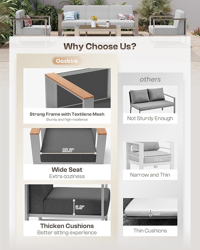 - Spacious Seating: Each seat in the Oasbira patio furniture set measures a generous 23.6"* 27.6", offering ample room to stretch out and relax. Perfect for daily use—this set ensures everyone can enjoy outdoor moments without feeling restricted