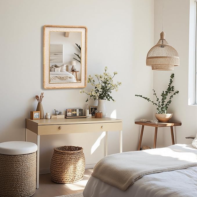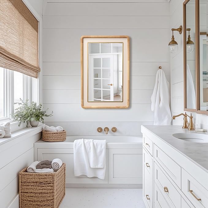 - Effcient Size: Measuring 35.4"H x 23.6"W with a 1.37" depth, this wood wall mirror can be as an entryway mirror, bedroom accent, living room decor, or organic modern bathroom mirror for powder rooms, adding functionality and layered style to your walls.