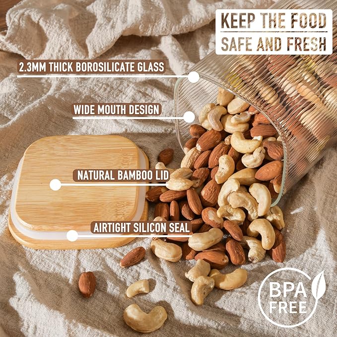 - [Multi-functional glass storage container]- This D2scrma airtight glass canisters with a natural bamboo lid and a good silicone seal ensures an airtight storage environment that keeps items fresh and extends their shelf life. Not only for kitchen storage, but even for pet food or other household items such as laundry beads, bathroom cotton balls, etc.
