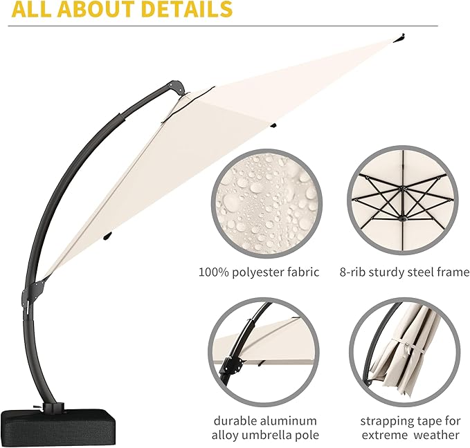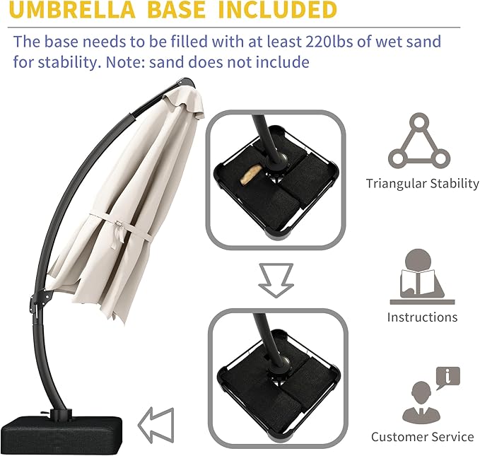 - 【Cantilever Umbrella with Base Included】This pool umbrella comes equipped with a sturdy cross-shaped base and 4 sandbags, which provide excellent stability, even in windy conditions. You can easily fill the sandbags with 220 lbs of sand for added weight, ensuring your umbrella stays securely in place while you relax outdoors. However, it is recommended to close the umbrella in windy weather.