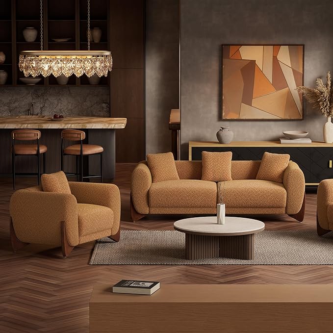 Morden Fort 3 Piece Boucle Sofa Set, Modern Upholstered Couches Sofas Set Durable Comfy Boucle Pet-Friendly, 2 Arm chairs & 3-Seater Sofa Sets for Living Room Bedroom Apartment, Toffee Orange