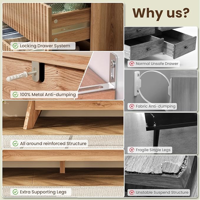- Modern Minimalist Style: The unique wave-like fluted panel enhances the texture and elegance of this bedroom dresser. The thick table top features natural wood grain that complements the natural oak finish. The wide metal handle and splayed base legs add a modern fluted dresser, creating a personalized and distinctive appearance of this closet dresser