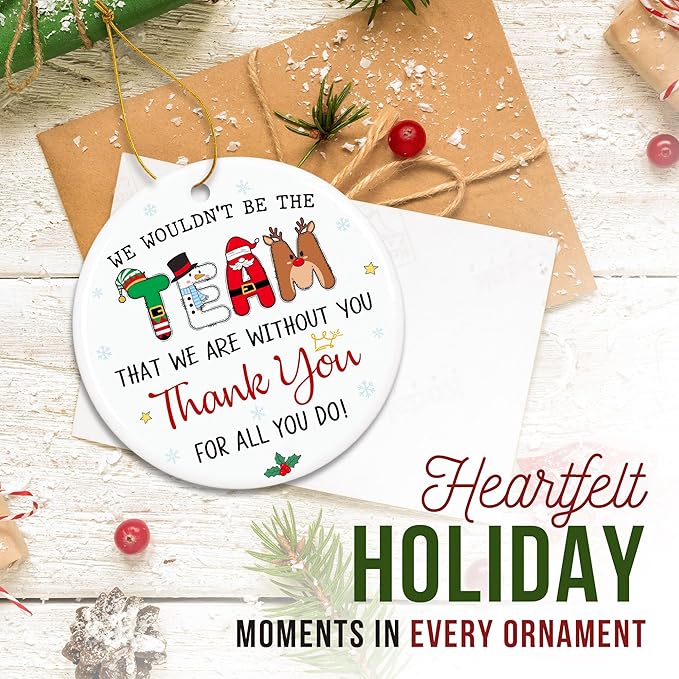 - CHRISTMAS TEAM GIFTS - Show your appreciation to the amazing people who make the workplace feel like a second home with this festive and cheerful team ornament. The playful lettering and holiday-themed characters make it a standout addition to any Christmas tree, while the heartfelt message reminds team members just how much they matter. It's a joyful way to celebrate unity, gratitude, and all the success shared throughout the year