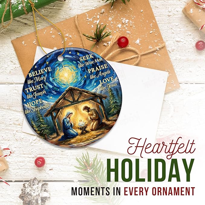 - NATIVITY SCENE CHRISTMAS ORNAMENTS - Bring the heart of the Christmas story into your home with this Nativity ornament. It captures the awe and reverence of the holy night with vivid colors and inspiring words. A perfect way to center your holiday décor on the true meaning of Christmas, this ornament adds spiritual beauty and peaceful reflection to any tree. Suitable as christian christmas ornament, faith christmas ornaments, catholic christmas ornaments, religious ornaments