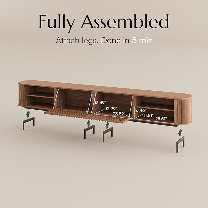 - Sliding Door TV stand: This mid century modern tv stand with slatted roll-up door design, easy-glide sliding track, smoothly glides to any position along the tv console table, it is elegant and prevents dust from entering the TV cabinet