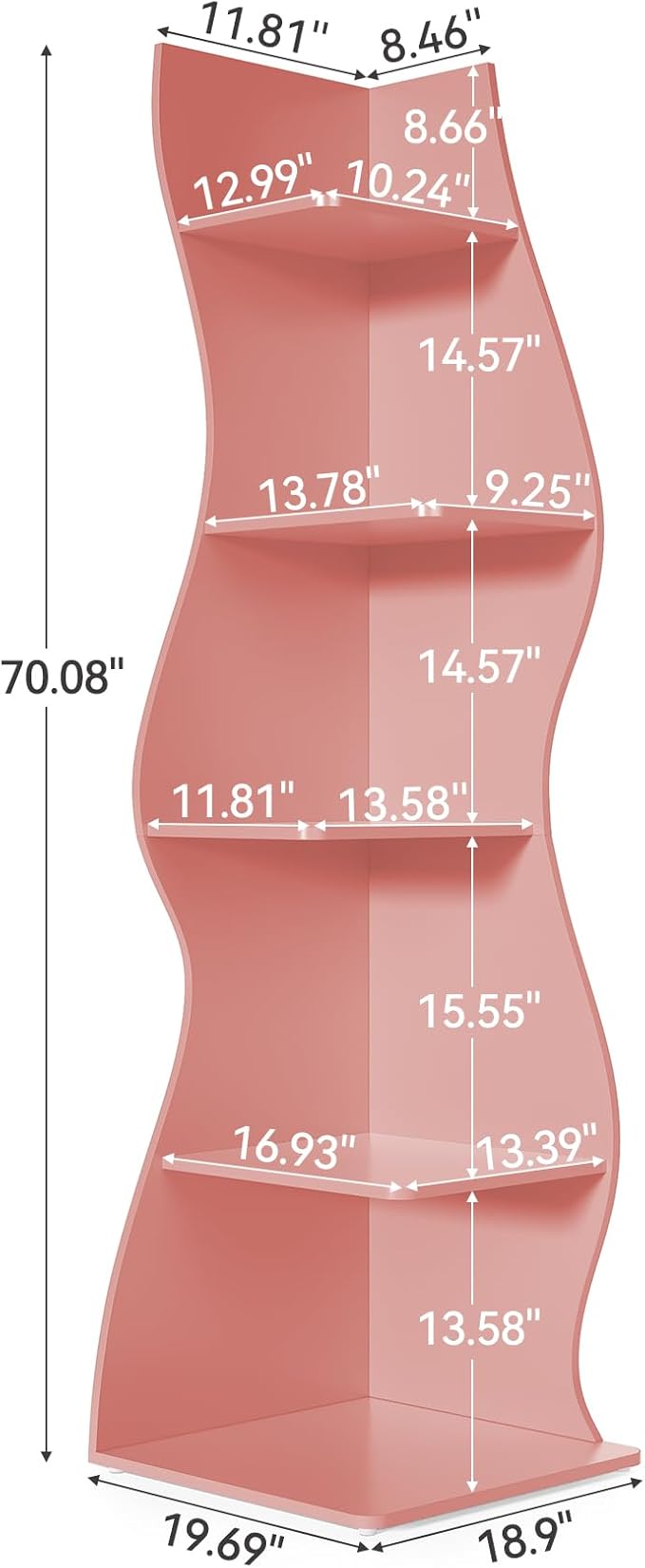 LITTLE TREE 70-Inch Corner Shelf, Seaweed Shaped Etagere Display Bookshelf, Freestanding 5-Tier Wall Shelves for Small Spaces, Living Room, Bedroom, Pink, 2 Pack