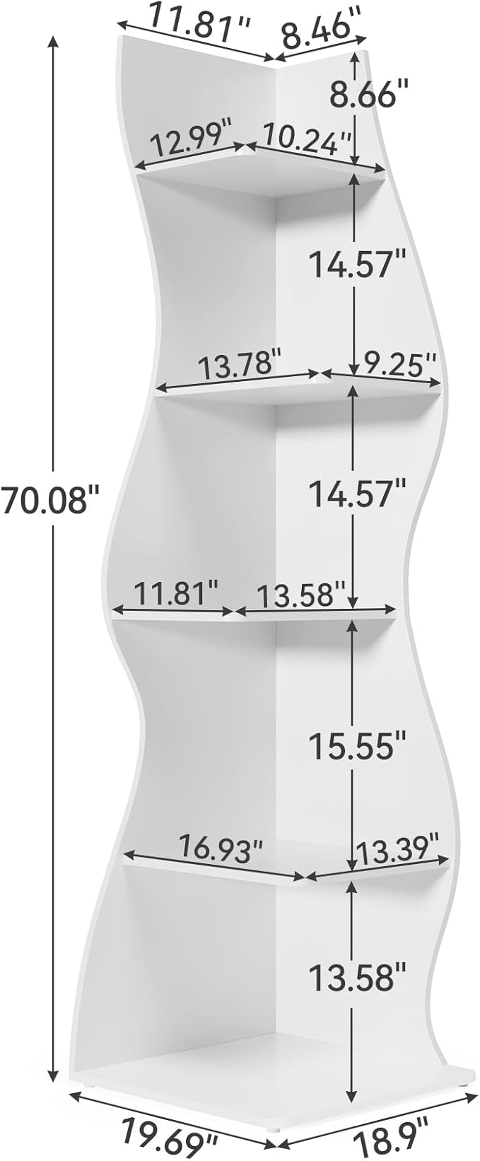 LITTLE TREE 70-Inch Corner Shelf, Seaweed Shaped Etagere Display Bookshelf, Freestanding 5-Tier Wall Shelves for Small Spaces, Living Room, Bedroom, White, 2 Pack