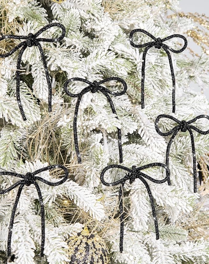 FLAIR GIFTS 6 Pcs 4.3" x 6" 2025 Christmas Bows for Tree Decor, Black Sparkly Glitter Rhinestone Bow Ornaments with Twist Tie for Xmas Decoration, Wreath, Garland, Gift Wrapping