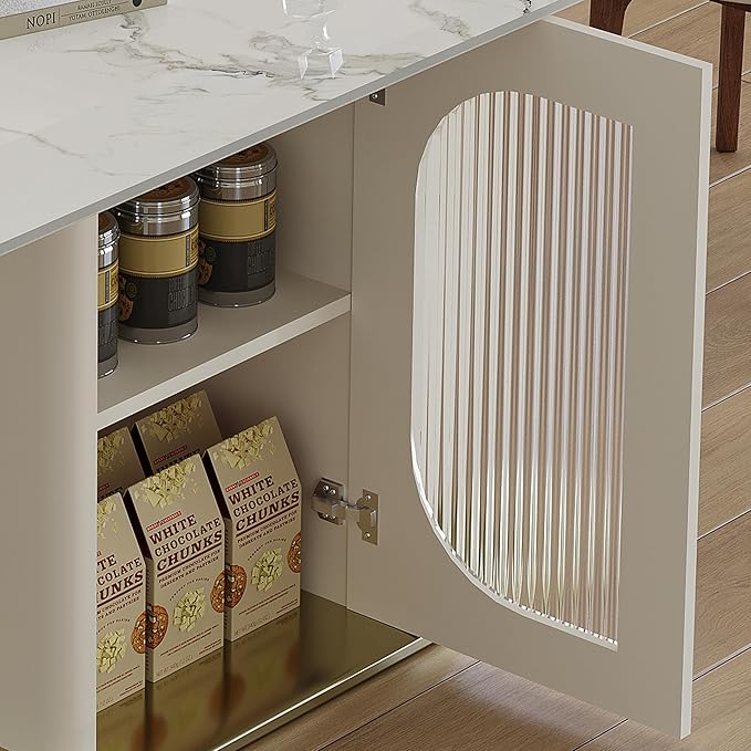 Montary 63" Modern 4-6 Person Dining Table with Storage Cabinet, Artificial Marble Dining Table with Sintered Stone Tabletop & Golden Solid Wood Base, Includes 6 Cream PU Chairs for Kitchen
