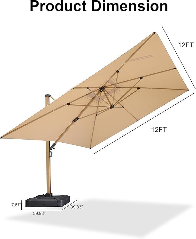 - All-weather teak dining table set: Includes 1 rectangular table (63.19"L x 38.39"W x 29.53"H) , 6 chairs (19.69"W x 19.69"D x 29.92"H, 16.54"SH) with 6 seat cushions and 6 back pillows, 1 beige umbrella (12'L x 12'W) and 1 Base (39.8"L x 39.8"W x 7.87"H).
