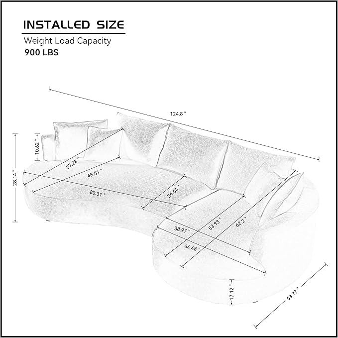 - OVERALL SIZE AND NO ASSEMBLY REQUIRED: 5-seat sofa: 124.8 “L x 63.97 ‘W x 28.14 ’H; weight limit: 900 lbs. No need to worry about assembly because the body of this sofa is pre-assembled, you just need to make simple additions to get a complete piece of furniture.