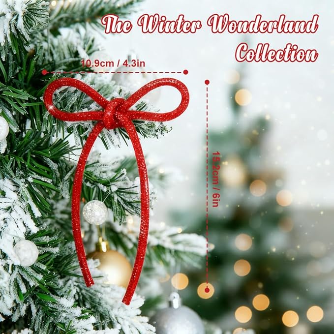 - Set of 10 Sparkling Ornaments: You’ll receive 10 Christmas bows, each 4.3 × 6 inches, complete with sturdy 9-inch twist ties. Perfect for crafting a coordinated Christmas tree bow topper or decorating multiple areas in your home.